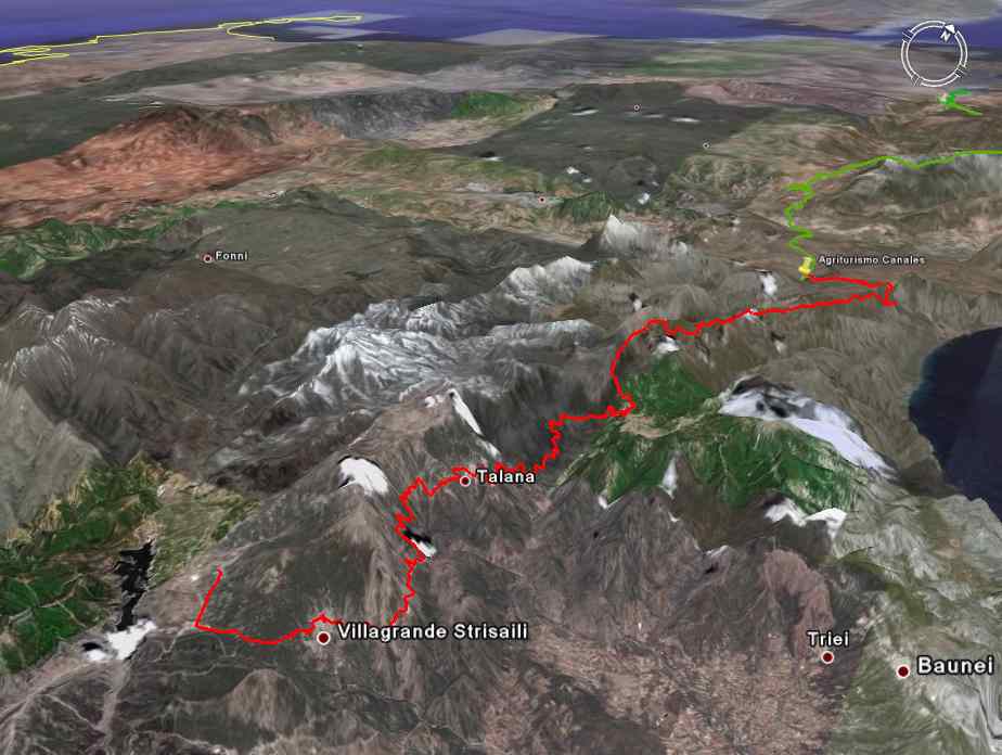 Sardininen - 5. TagVon Dorgali nach Villanova StrisailiStrecke als Google-Earth-Screensshot Am fünften Tag ging es gleich nach oben über den Pass Genno Silana. Die Straße war entgegen unseren Befürchtungen kaum befahren und die Steigung war sehr angenehm. Oben angelangt war das Wetter leider nicht mehr so gut, aber dafür der Käse, den wir in der Käserei an der Straße gekauft haben. Abenteurlich ist die Straße zwischen Talana und Villagrande Strisaili. Sie wurde vor zwei Jahren durch einen Erdrutsch zerstört und kann mit dem Auto nicht mehr befahren werden. Mit dem Fahrrad kommt man noch durch, wir haben eben an einigen Stellen geschoben.