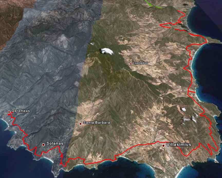 Sardininen - 9. TagVon Muravera nach GeremeasStrecke als Google-Earth-Screensshot Heute führt unser Weg von Muravera nach Geremeas. Morgens hat es noch geregnet, so dass wir die ungeteerten Sträßchen, die wir ursprünglich wollten, nicht alle fahren konnten. An der Costa Rei war es sehr schön zu fahren, allerdings die Küstenstraße im Süden war wohl landschaftlich auch sehr schön, aber es gab etwas viel Verkehr.