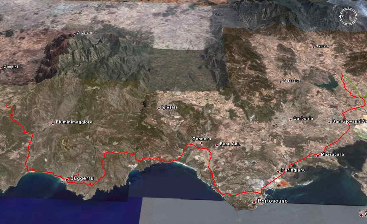 Sardininen - 13. TagVon Giba zum Agriturismo Rocce BiancheStrecke als Google-Earth-Screensshot Zuerst war es flach und die Straßen gerade, das war ziehmlich langweilig zu fahren - das änderte sich aber noch.
