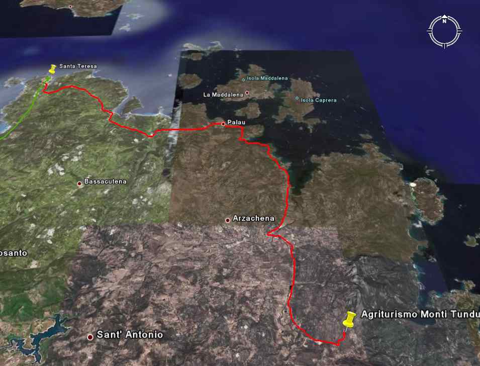 Sardininen - 24. TagSanta Teresa - Agriturismo Monti TunduStrecke als Google-Earth-Screensshot Das erste Stück war auf einer wunderbare Strasse - erst als wir wieder auf der SS125 war der Verkehr zu viel und auch die Autofahrer zu schnell. Die Strasse führt direkt am Meer entlang... ...oder bietet schöne Ausblicke auf das Meer Das Agriturismo Monti Tundu liegt schön am Hang.